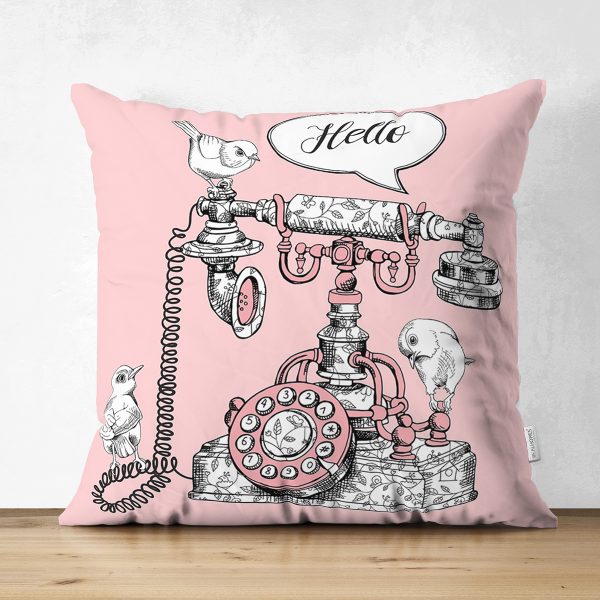 Çift Taraflı Pembe Zemin Antika Telefon Tasarımlı Dijital Baskılı Modern Süet Yastık Kırlent Kılıfı