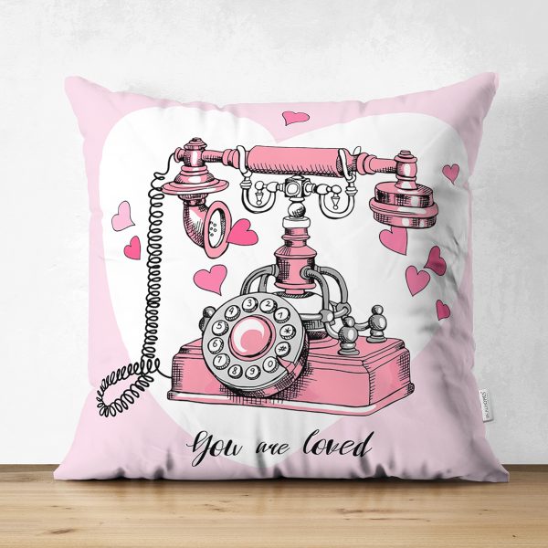Çift Taraflı Pembe Zemin Kalpli Antika Telefon Tasarımlı Dijital Baskılı Dekoratif Süet Yastık Kırlent Kılıfı