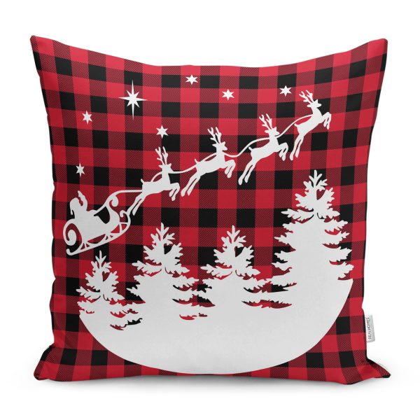 Kırmızı Ekose Tasarımlı Noel Baba Geyikleri Modern Yastık Kırlent Kılıfı