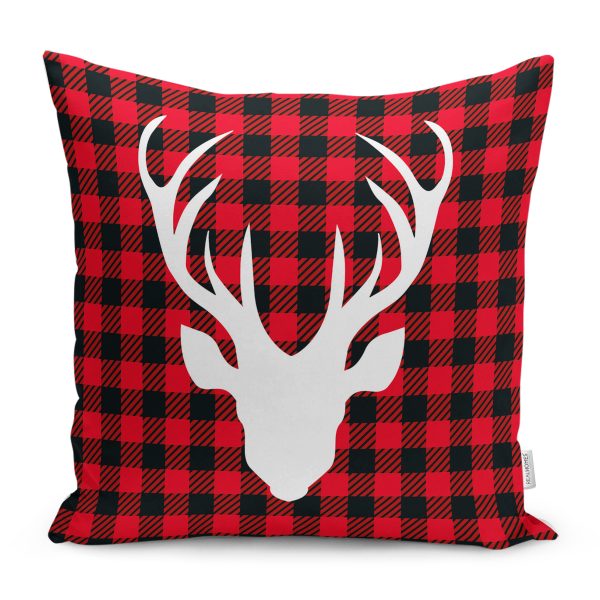 Yılbaşı Temalı Kırmızı Siyah Ekose Zeminli Geyik Motifli Yastık Kırlent Kılıfı