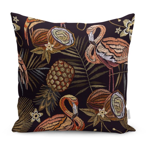 Koyu Zeminli Flamingo Ananas Motifli Yastık Kırlent Kılıfı