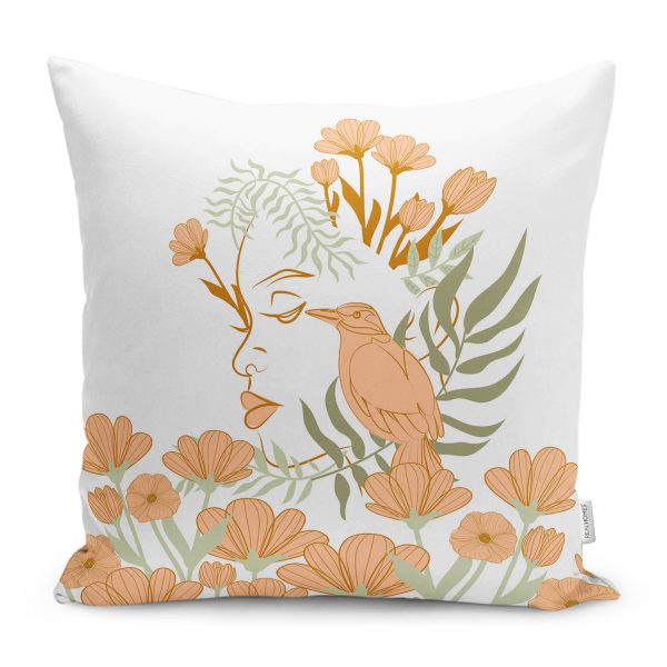 Onedraw Çiçekli Kuş & Kadın Çizimli Dekoratif Yastık Kırlent Kılıfı