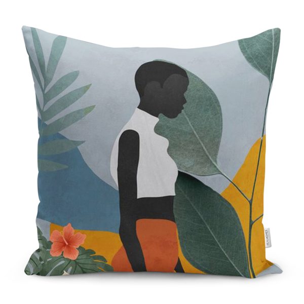 Tropik Yapraklar Zeminli Siyahi Kadın Figürlü Yastık Kırlent Kılıfı