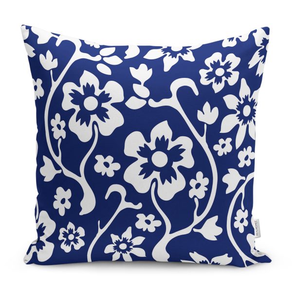 Lacivert Zeminli Beyaz Tropik Yaprak Motifli Yastık Kırlent Kılıfı