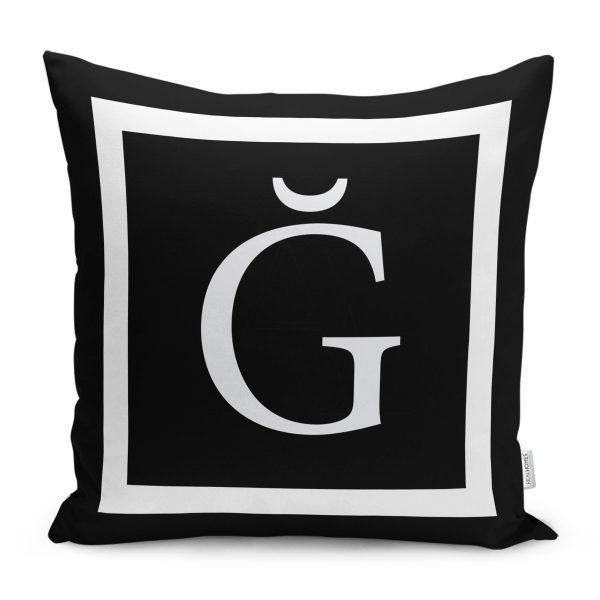 Siyah Zemin Beyaz Çerçeveli Ğ Harfi Dijital Baskılı Kırlent Kılıfı