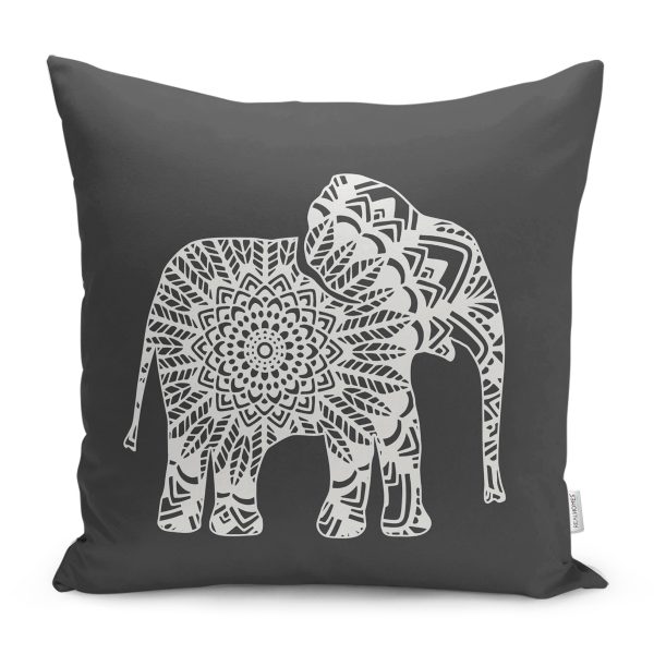 Koyu Gri Zeminli Etnik Fil Motifli Dekoratif Yastık Kırlent Kılıfı