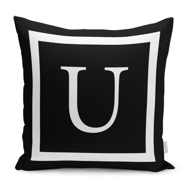 Siyah Zemin Beyaz Çerçeveli U Harfi Dijital Baskılı Kırlent Kılıfı