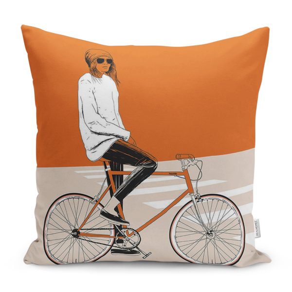 Koyu Turuncu Krem Zemin Bisikletli Adam Motifli Yastık Kırlent Kılıfı