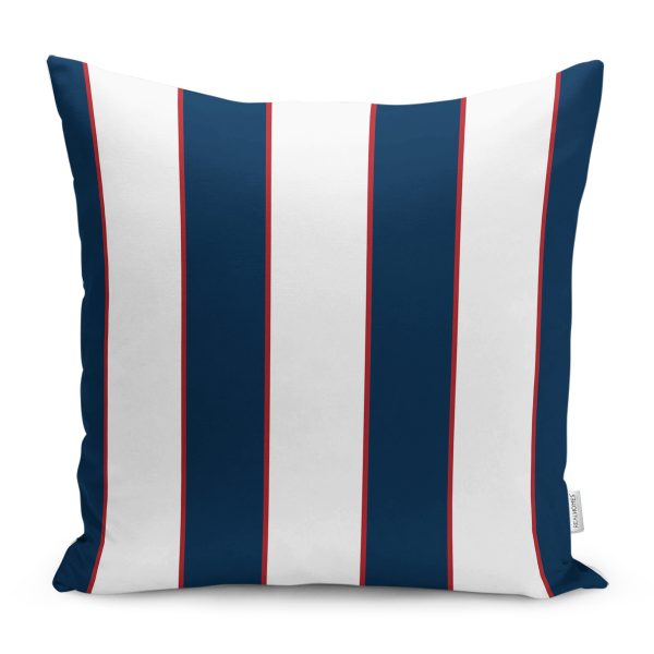 Kırmızı Detaylı Lacivert Beyaz Çizgili Yastık Kırlent Kılıfı