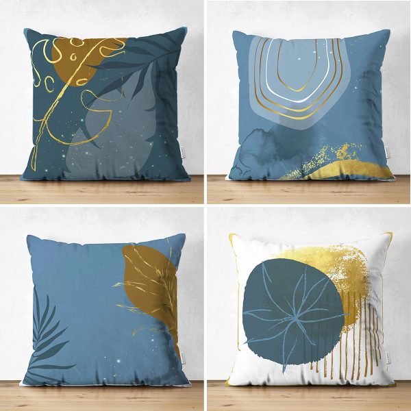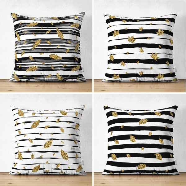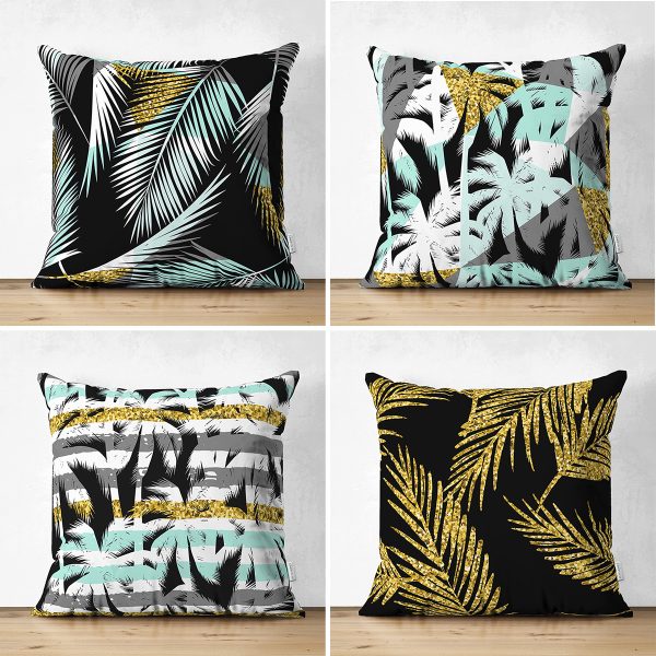 4’lü Çift Taraflı Renkli Zemin Üzerinde Gold Detaylı Yaprak Desenli Modern Süet Yastık Kırlent Kılıf Seti