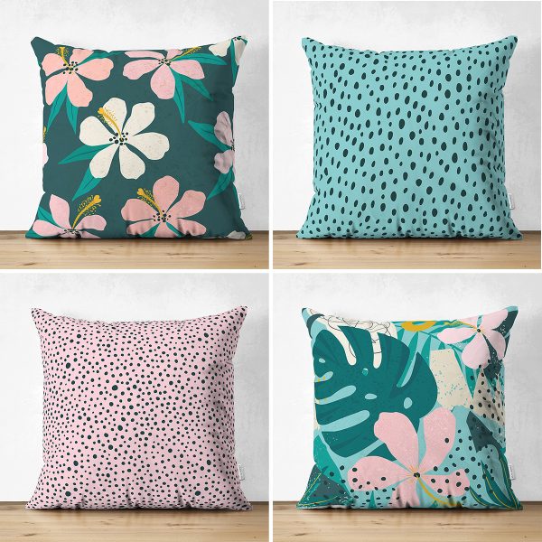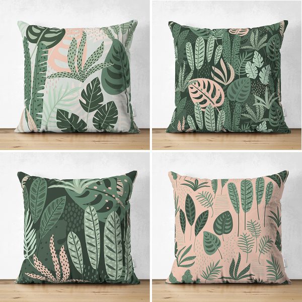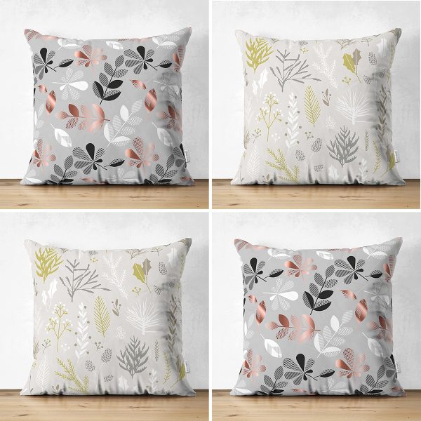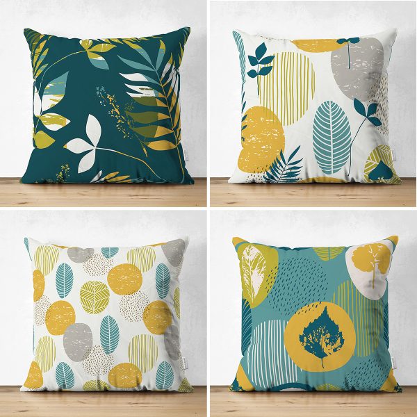 4’lü Çift Taraflı Renkli Zemin Yaprak Desenli Modern Süet Yastık Kırlent Kılıf Seti