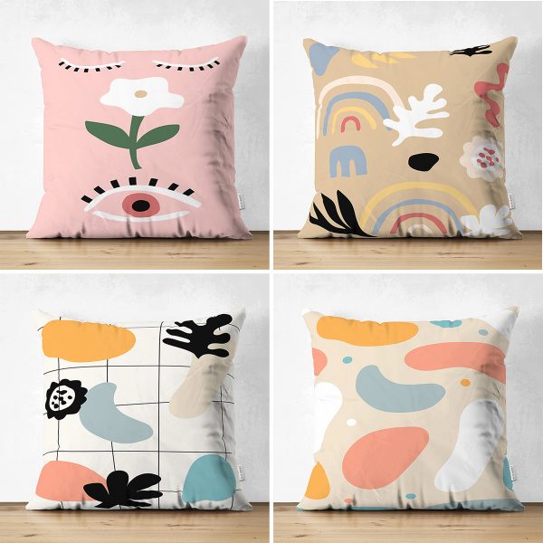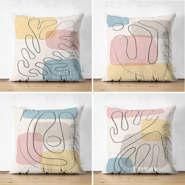 4’lü Çift Taraflı Renkli Zemin Üzerinde Onedraw Çizimli Modern Süet Yastık Kırlent Kılıf Seti