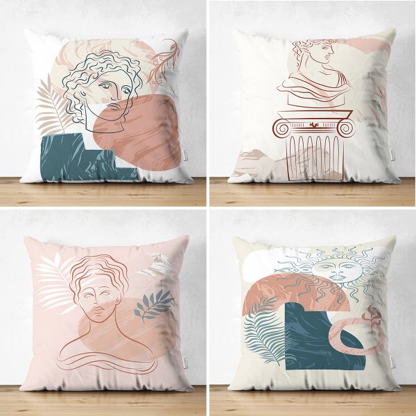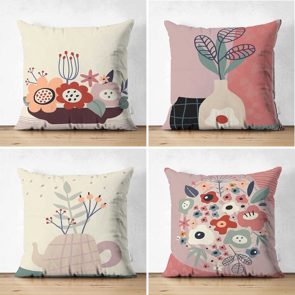 4’lü Çift Taraflı Renkli Zemin Üzerinde Onedraw Çizimli Vazo Desenli Modern Süet Yastık Kırlent Kılıf Seti