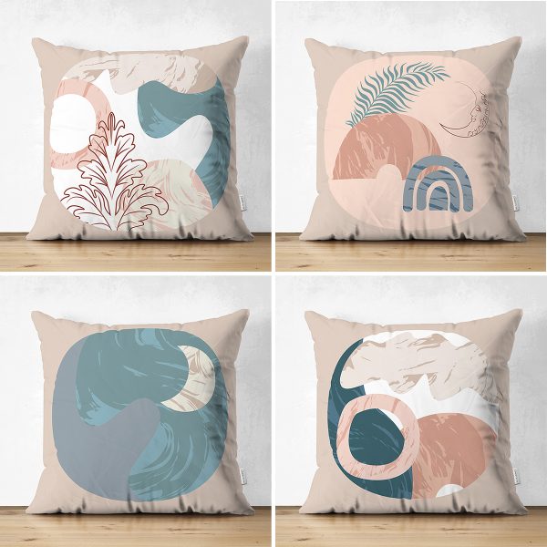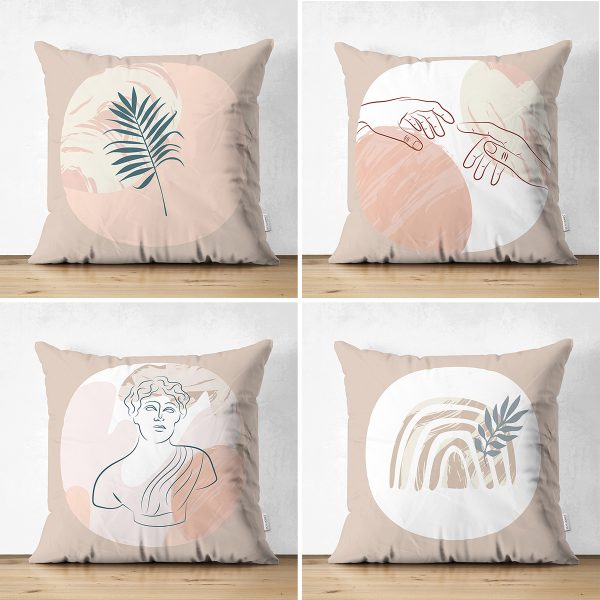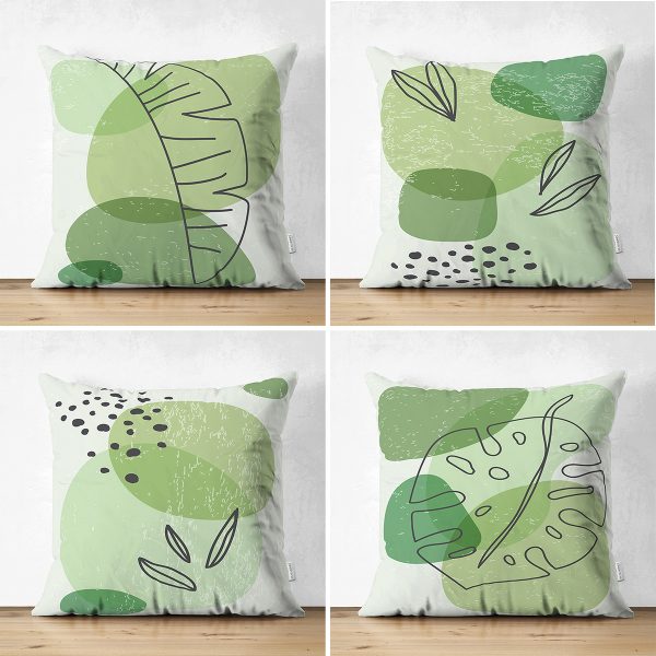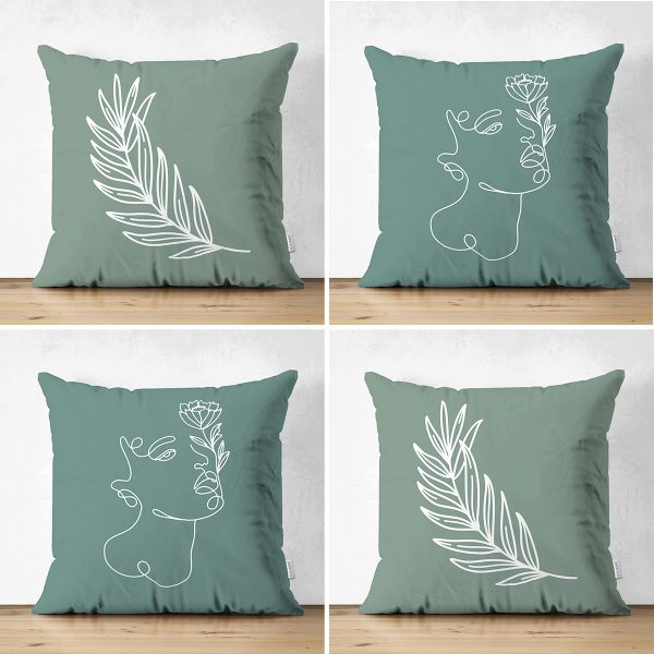 4’lü Çift Taraflı Renkli Zemin Üzerinde Onedraw Çizimli Yaprak Desenli Modern Süet Yastık Kırlent Kılıf Seti