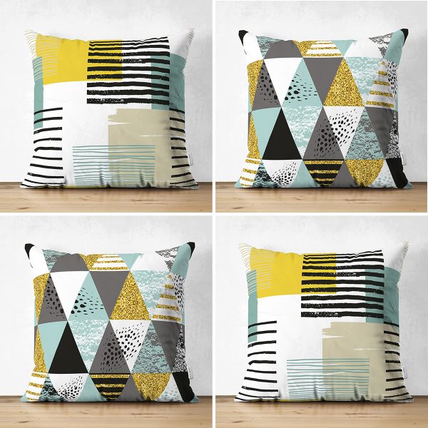 4’lü Çift Taraflı Renkli Zemin Üzerinde Geometrik Çizimli Modern Süet Yastık Kırlent Kılıf Seti