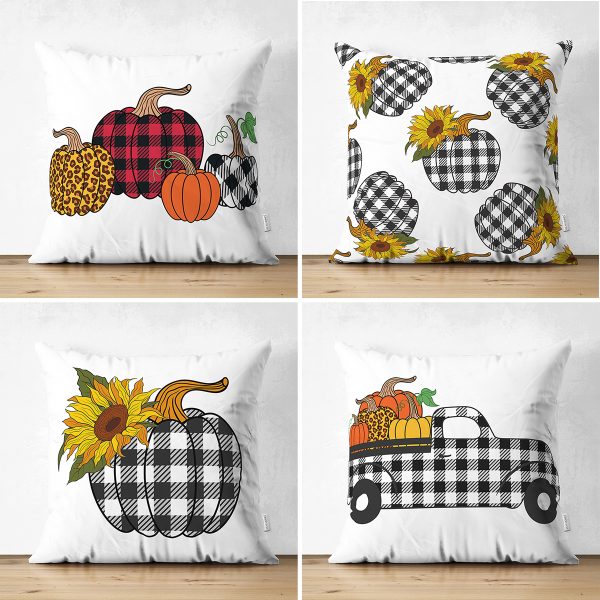 4’lü Çift Taraflı Ekoseli Kabak Desenli Dijital Baskılı Kombin Süet Yastık Kırlent Kılıfı