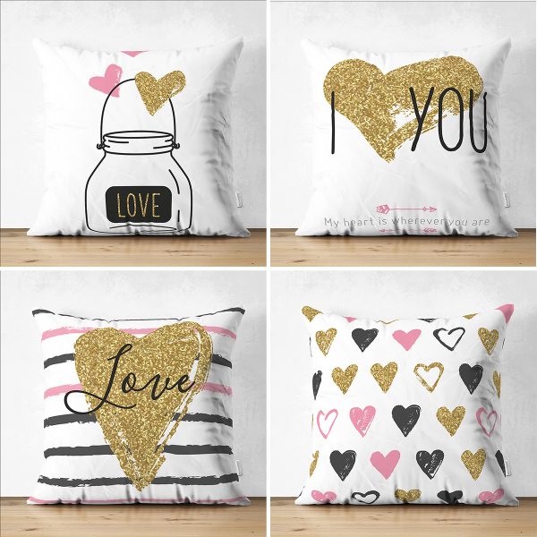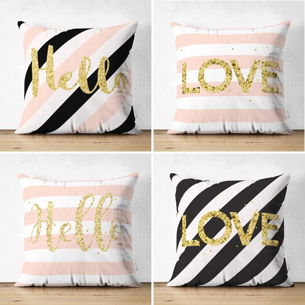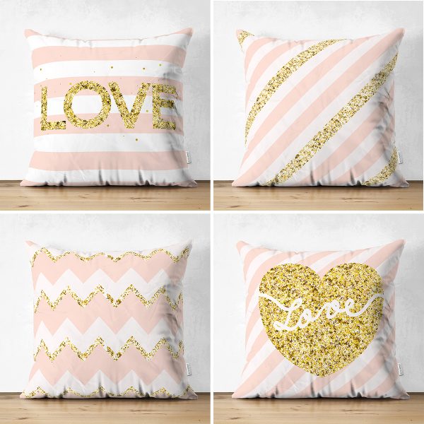 4’lü Çift Taraflı Renkli Zemin Üzerinde Gold Detaylı Love Yazılı Modern Süet Yastık Kırlent Kılıf Seti