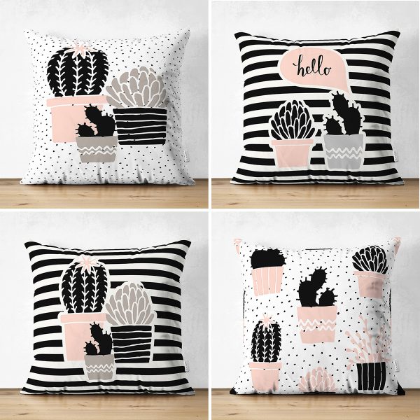 4’lü Çift Taraflı Beyaz Zemin Üzerinde Onedraw Çizimli Kaktüs Desenli Modern Süet Yastık Kırlent Kılıf Seti
