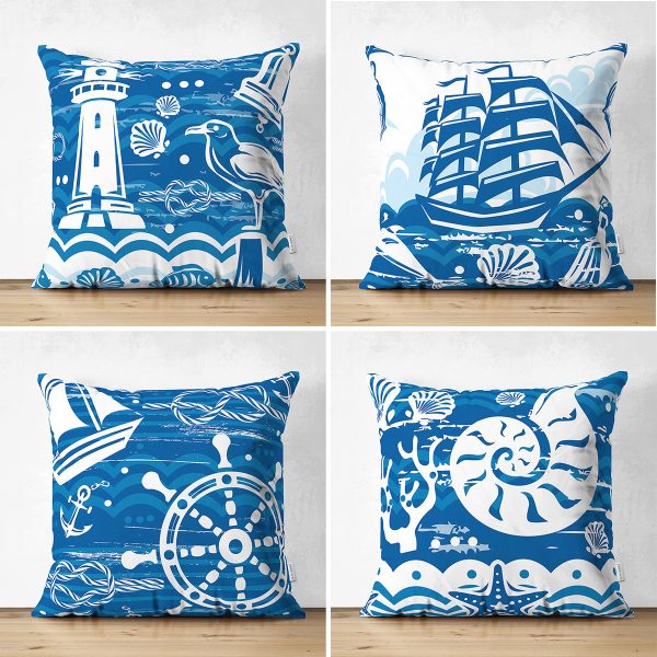 4’lü Çift Taraflı Renkli Zemin Üzerinde Gemici Desenli Modern Süet Yastık Kırlent Kılıf Seti