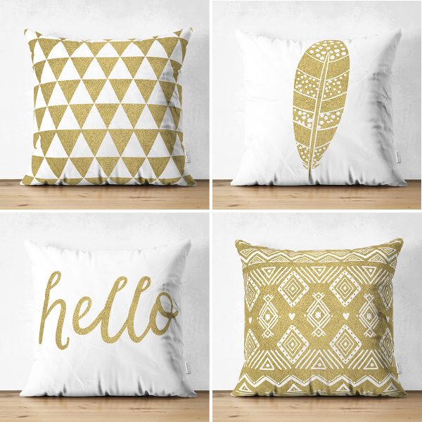 4’lü Çift Taraflı Beyaz Zemin Üzerinde Gold Detaylı Modern Süet Yastık Kırlent Kılıf Seti
