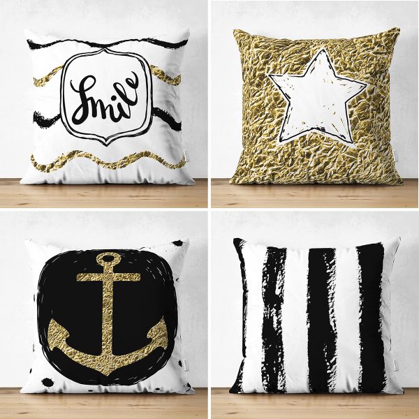 4’lü Çift Taraflı Siyah Beyaz Altın Varaklı Motifler Dijital Baskılı Süet Yastık Kırlent Kılıf Seti