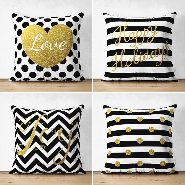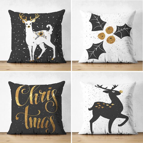 4’lü Çift Taraflı Siyah Zemin Üzerinde Gold Detaylı Yılbaşo Desenli Modern Süet Yastık Kırlent Kılıf Seti