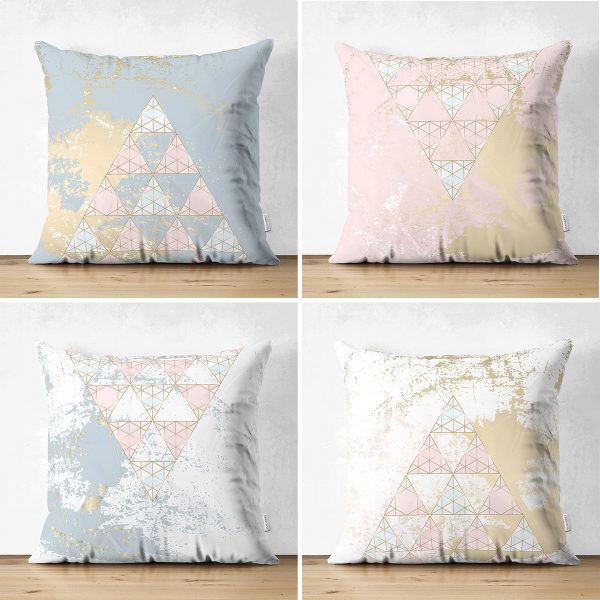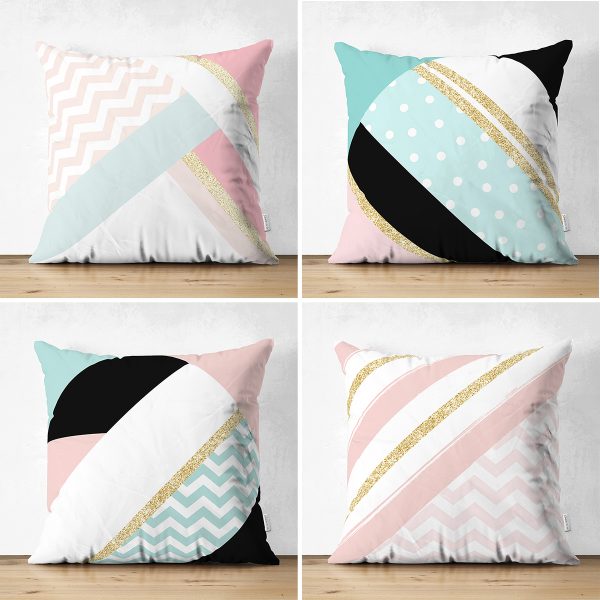 4’lü Çift Taraflı Renkli Zemin Üzerinde Gold Detaylı Geometrik Desenli Modern Süet Yastık Kırlent Kılıf Seti