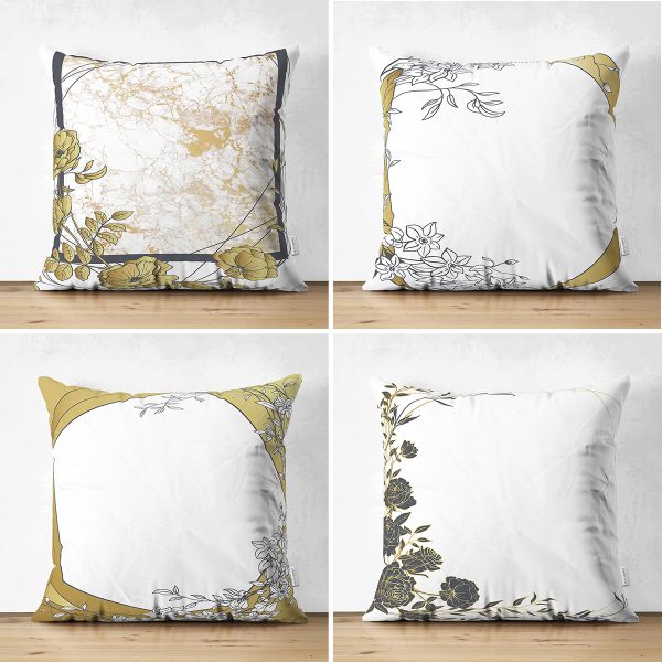 4’lü Çift Taraflı Beyaz Zemin Üzerinde Gold Detaylı Yaprak Desenli Modern Süet Yastık Kırlent Kılıf Seti