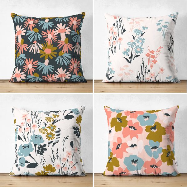 4’lü Çift Taraflı Rengarenk Zemin Üzerinde Çiçek Desenli Modern Süet Yastık Kırlent Kılıf Seti
