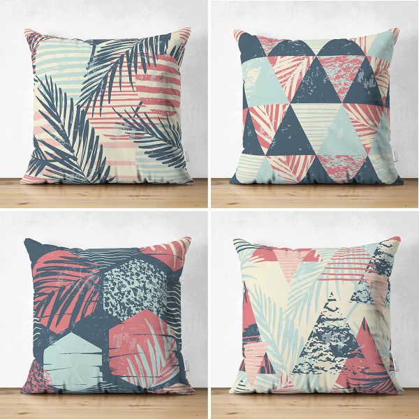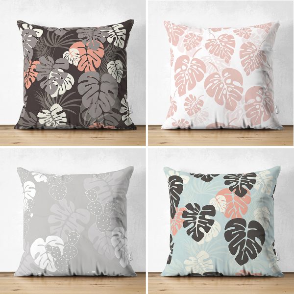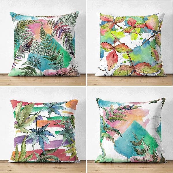 4’lü Çift Taraflı Renkli Zemin Üzerinde Yaprak Desenli Modern Süet Yastık Kırlent Kılıf Seti
