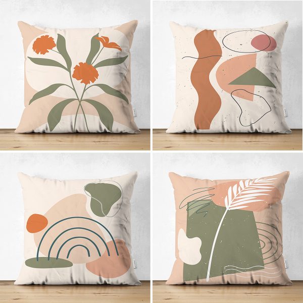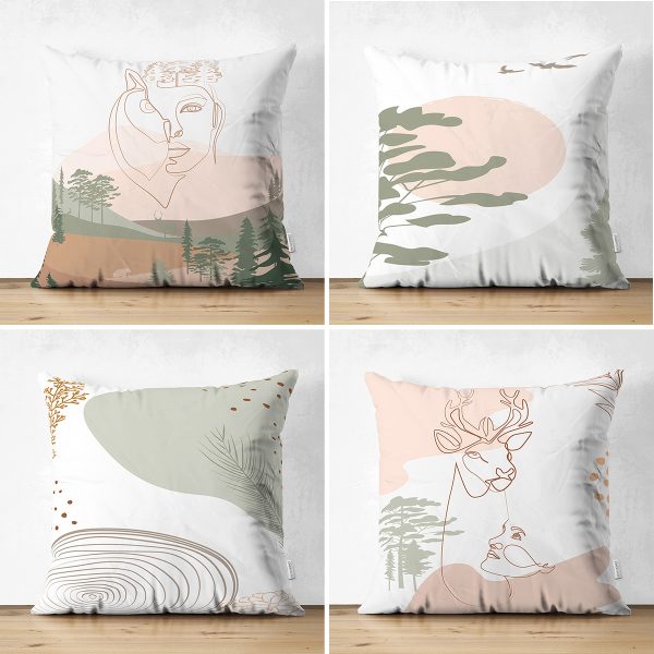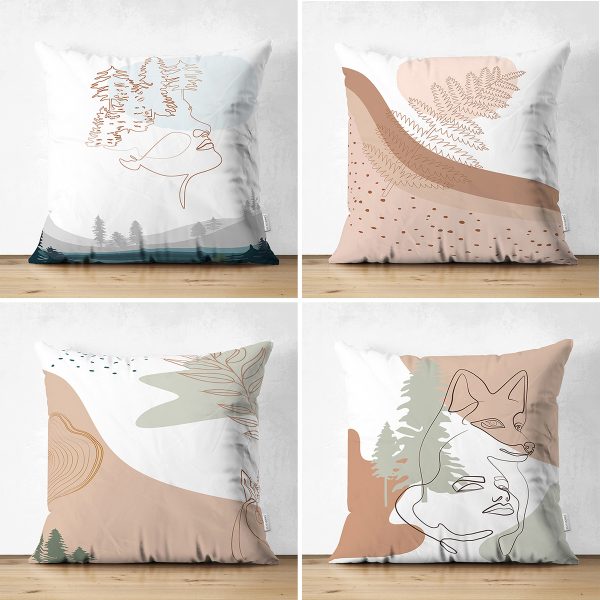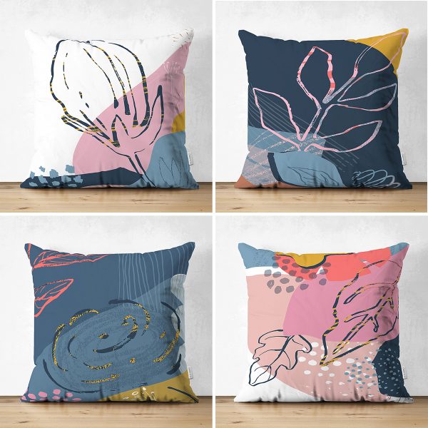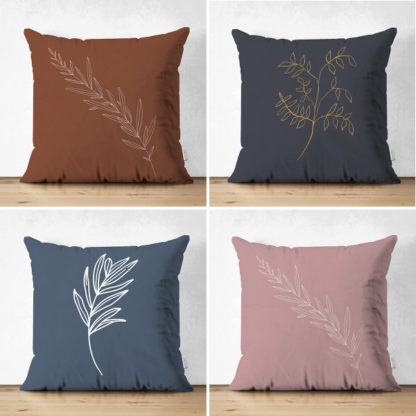 4’lü Çift Taraflı Renkli Zemin Üzerinde Onedraw Çizimli Yaprak Desenli Modern Süet Yastık Kırlent Kılıf Seti