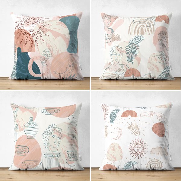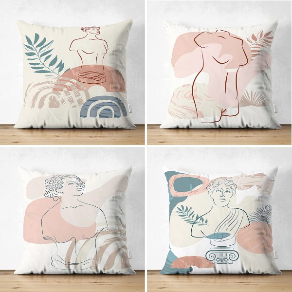 4’lü Çift Taraflı Renkli Zemin Üzerinde Onedraw Çizimli Bayan Silüeti Modern Süet Yastık Kırlent Kılıf Seti