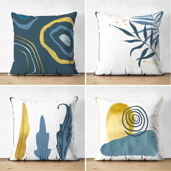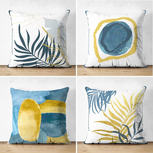 4’lü Çift Taraflı Renkli Zemin Üzerinde Gold Detaylı Yaprak Desenli Modern Süet Yastık Kırlent Kılıf Seti