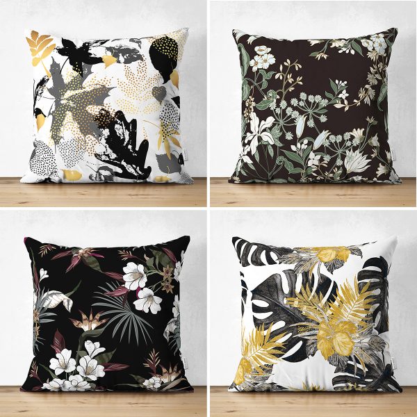 4’lü Çift Taraflı Siyah Zemin Üzerinde Gold Detaylı Yaprak Desenli Modern Süet Yastık Kırlent Kılıf Seti