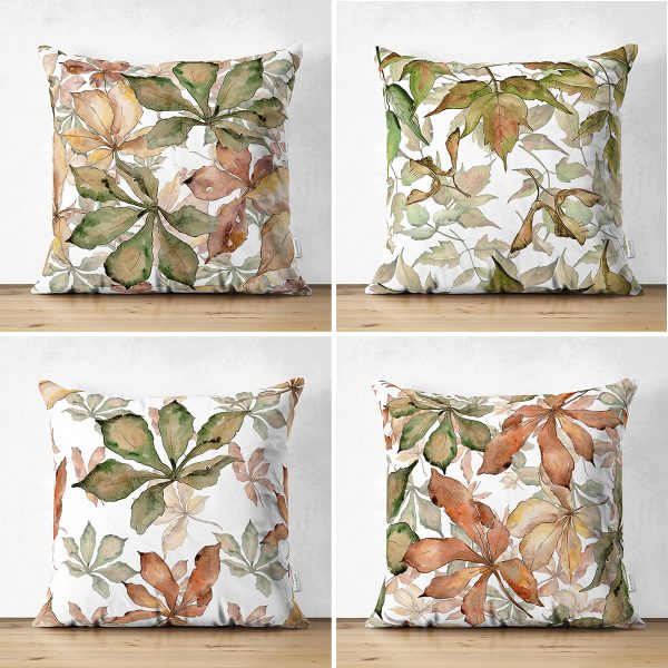 4’lü Çift Taraflı Beyaz Zemin Üzerinde Sonbahar Yaprağı Desenli Modern Süet Yastık Kırlent Kılıf Seti
