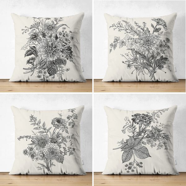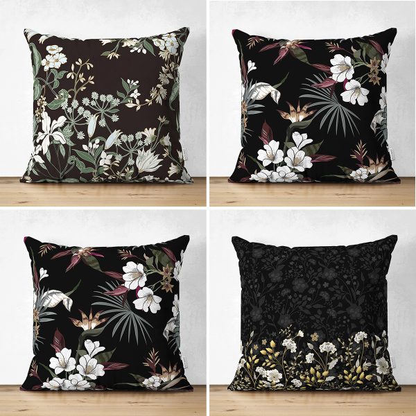 4’lü Çift Taraflı Siyah Zemin Üzerinde Çiçek Desenli Modern Süet Yastık Kırlent Kılıf Seti