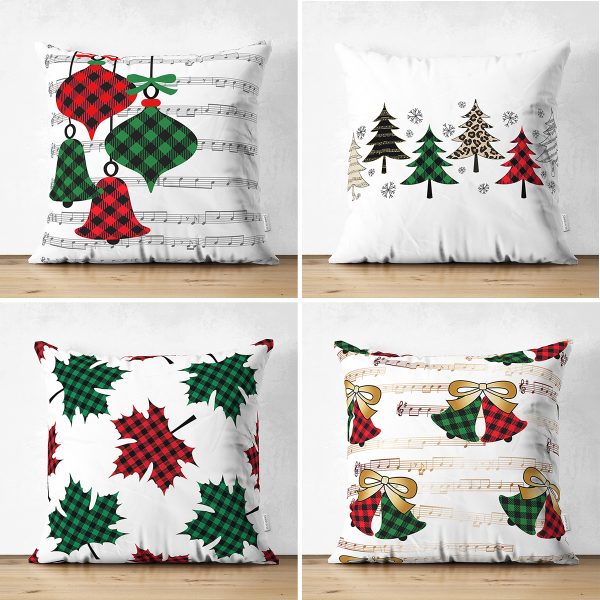 4’lü Çift Taraflı Ekose Temalı Çanlar ve Çam Ağacı Yılbaşı Kombin Modern Süet Yastık Kırlent Kılıfı