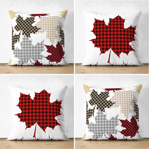 4’lü Çift Taraflı Yaprak Tasarımlı Ekoseli Yılbaşı Konsept Modern Süet Yastık Kırlent Kılıfı