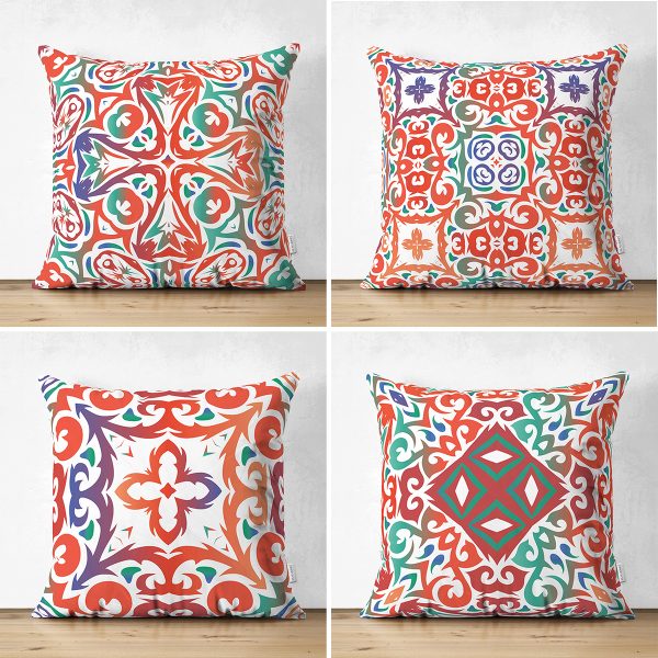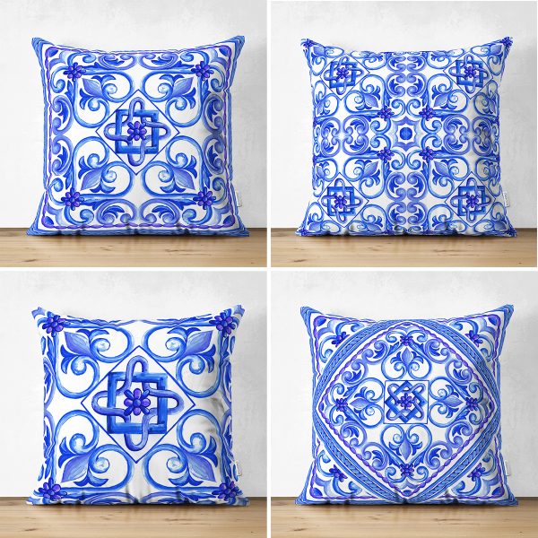 4’lü Çift Taraflı Beyaz Zemin Üzerinde Çini Desenli Modern Süet Yastık Kırlent Kılıf Seti