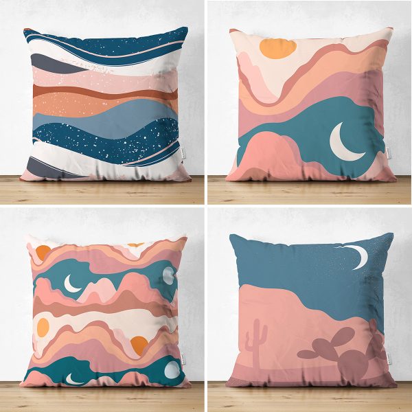 4’lü Çift Taraflı Dağ ve Ay Tasarımlı Dijital Baskılı Dekoratif Süet Yastık Kırlent Kılıfı Seti