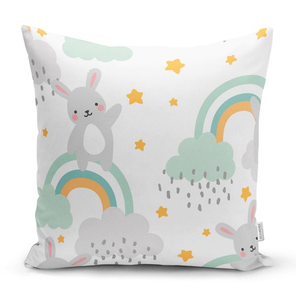 Realhomes Gökkuşağı Üzerinde Tavşan Motifli Özel Tasarım Dijital Baskılı Modern Yastık Kırlent Kılıfı