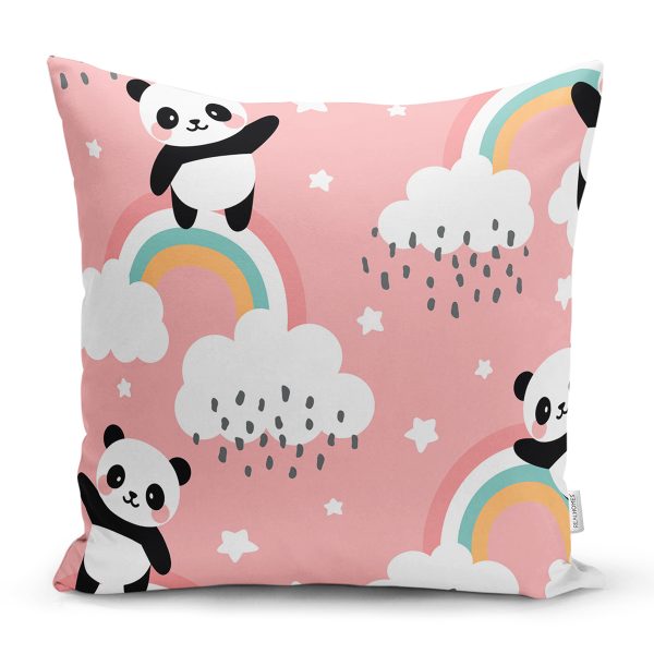 Pembe Zeminde Bulutlar Ve Panda Dijital Baskılı Özel Tasarım Modern Yastık Kırlent Kılıfı