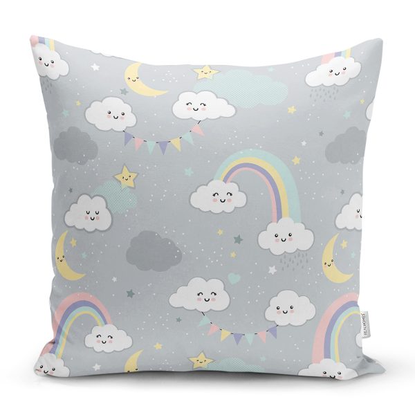 Gri Zeminde Gökkuşağı Ve Bulutlar Dijital Baskılı Özel Tasarım Modern Yastık Kırlent Kılıfı