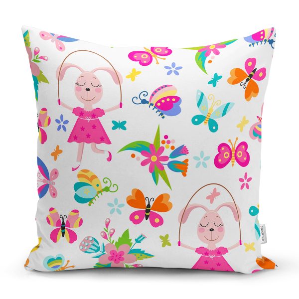 İp Atlayan Tavşan Ve Kelebek Desenli Dijital Baskılı Özel Tasarım Modern Yastık Kırlent Kılıfı