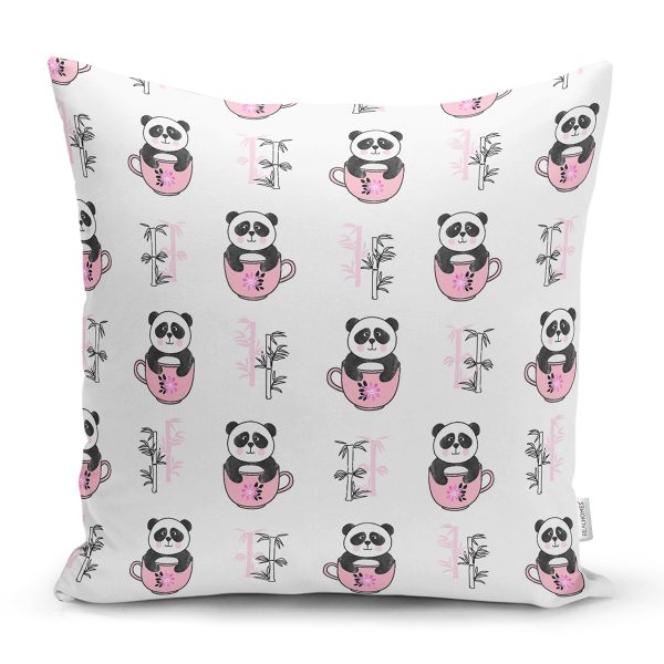 Pembe Bardak İçinde Panda Motifli Dijital Baskılı Özel Tasarım Modern Yastık Kırlent Kılıfı