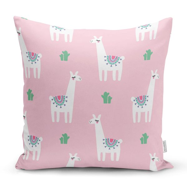 Pembe Zeminde Lama Desenli Dijital Baskılı Özel Tasarım Modern Yastık Kırlent Kılıfı