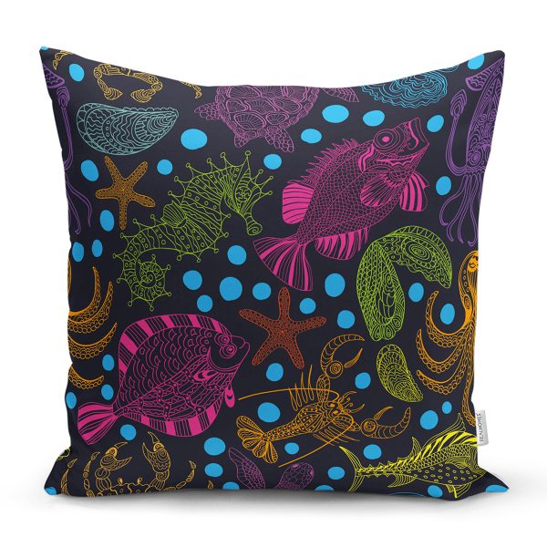 Siyah Zeminde Deniz Canlıları Çizimli Modern Yastık Kırlent Kılıfı