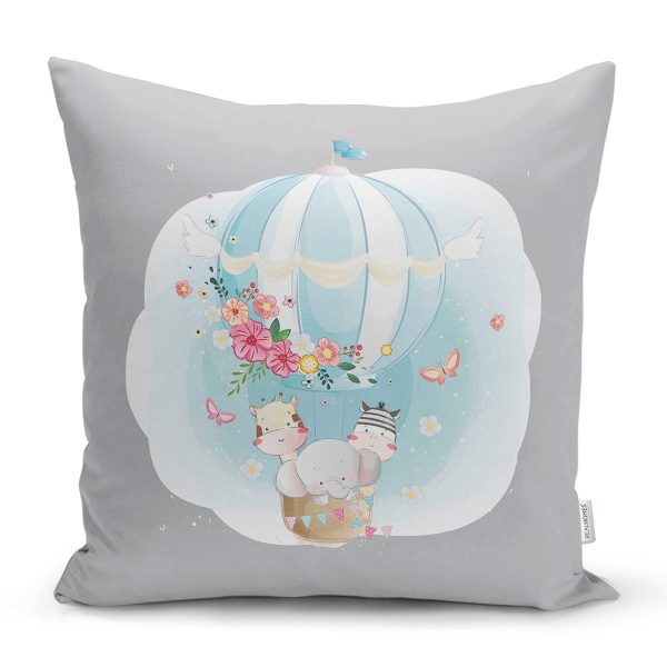Realhomes Gri Zeminde Uçan Balon Desenli Dijital Baskılı Modern Yastık Kırlent Kılıfı
