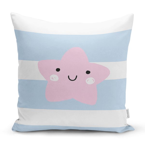 Realhomes Mavi Çizgiler Üzerine Pembe Yıldız Tasarımlı Modern Yastık Kırlent Kılıfı