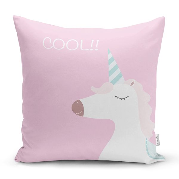 Pembe Zemin Cool Yazılı Unicorn Baskılı Dijital Baskılı Çocuk Odası Yastık Kırlent Kılıfı